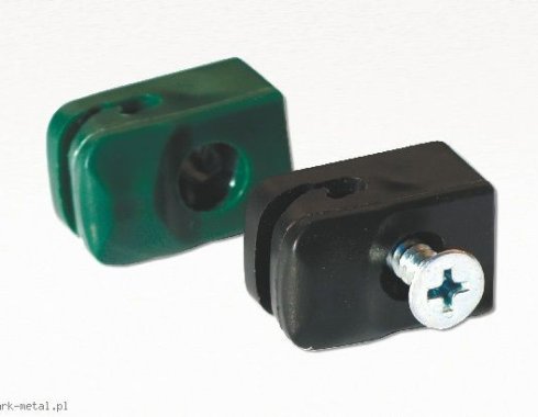 Element mocujący drut naciągowy do słupka ogrodzeniowego. Wykonany z mrozoodpornego tworzywa sztucznego. Wyposażony w stalowy, ocynkowany trzpień rozporowy, stabilizujący położenie drutu naciągowego.